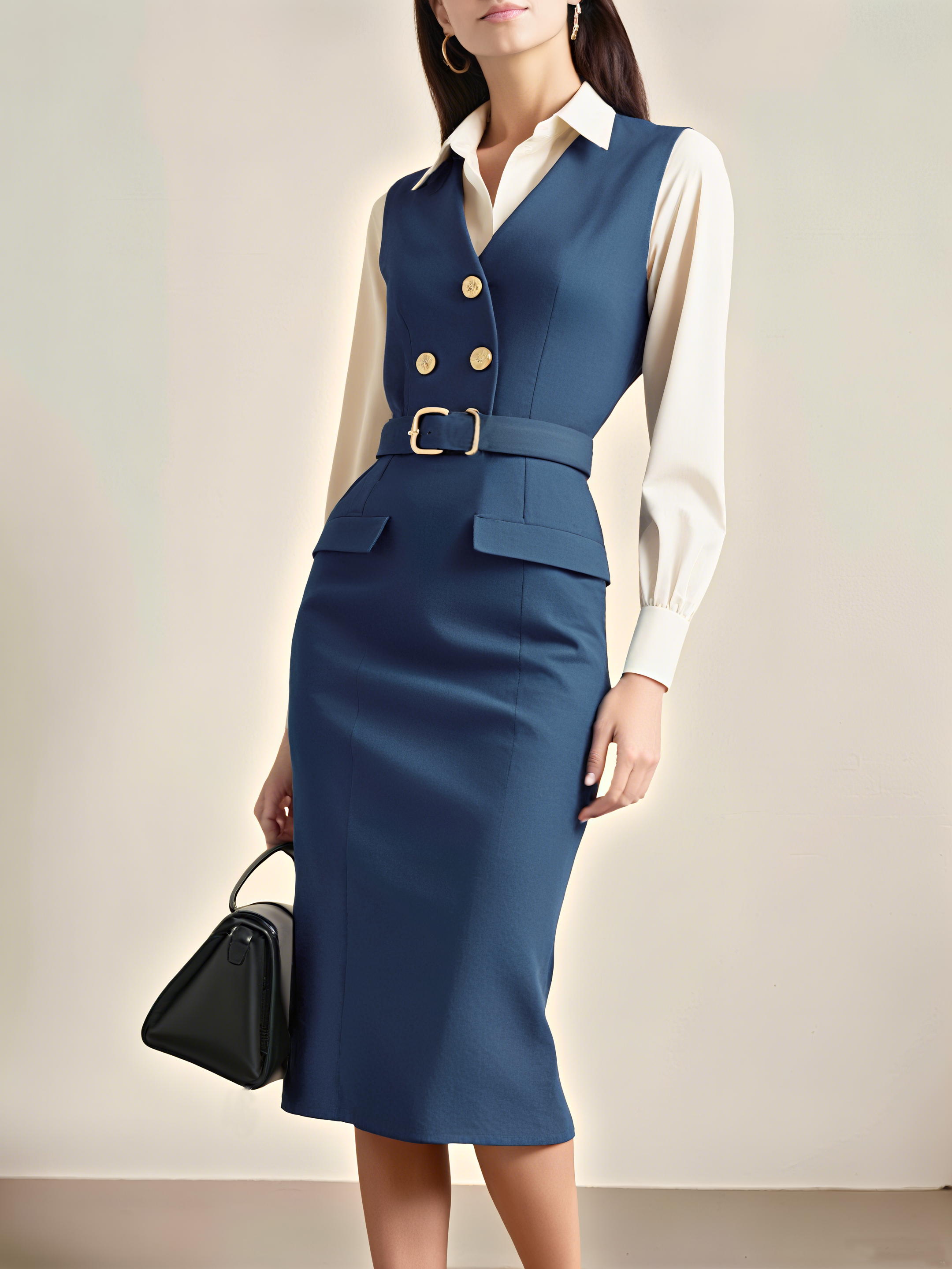 Elegant Plain Regular Sleeve Lapel Collar Midi Dress Belt
