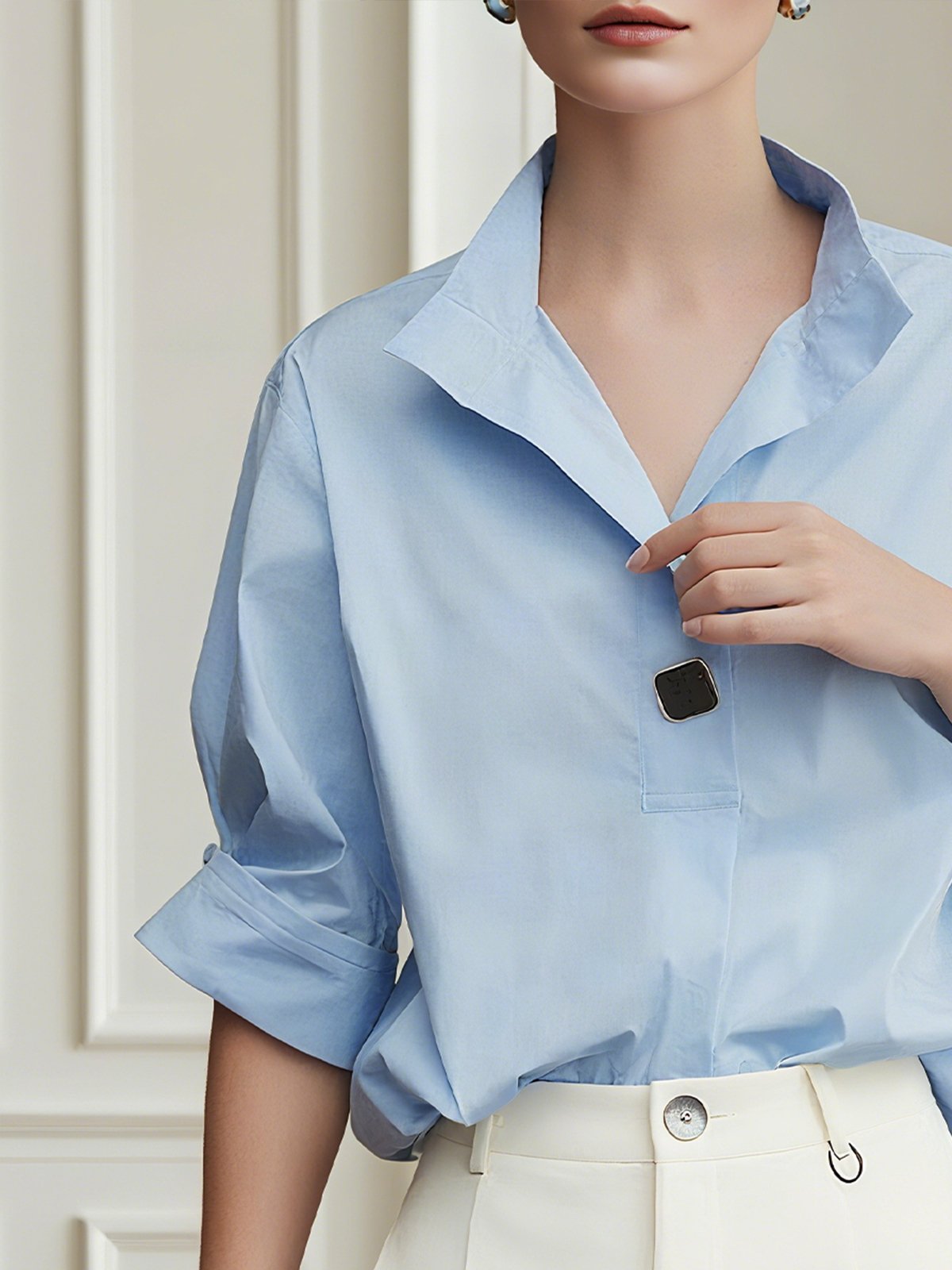 Cotton Urban Plain Shawl Collar Regular Sleeve Blouse