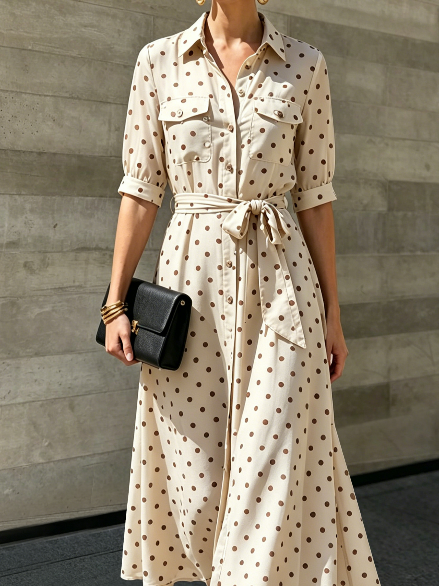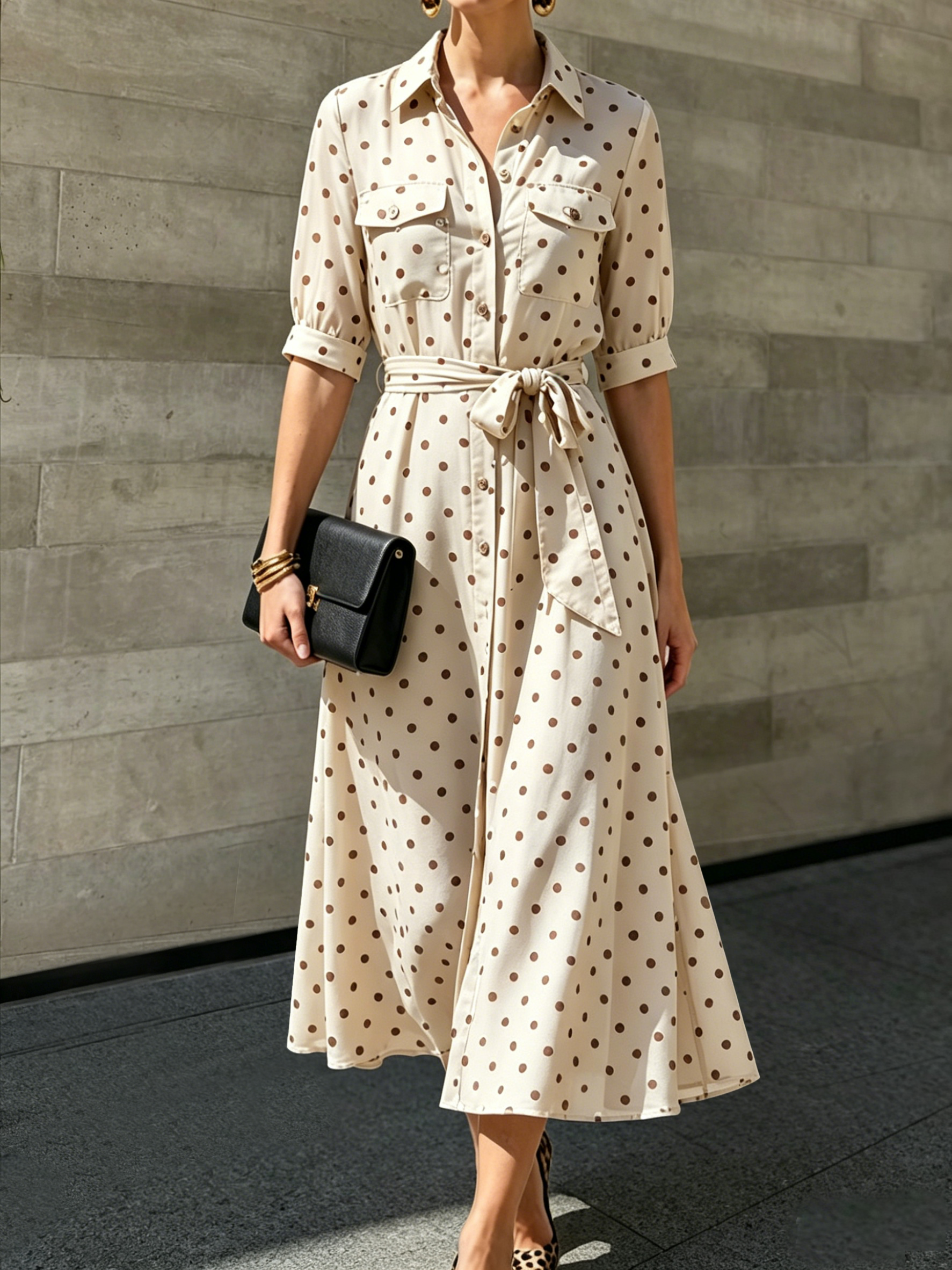 Polka Dots Elegant Shirt Collar Dress With Belt