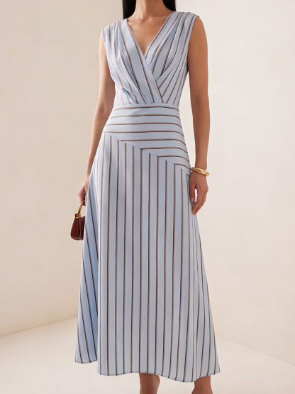 V Neck Elegant Regular Fit Striped Dress